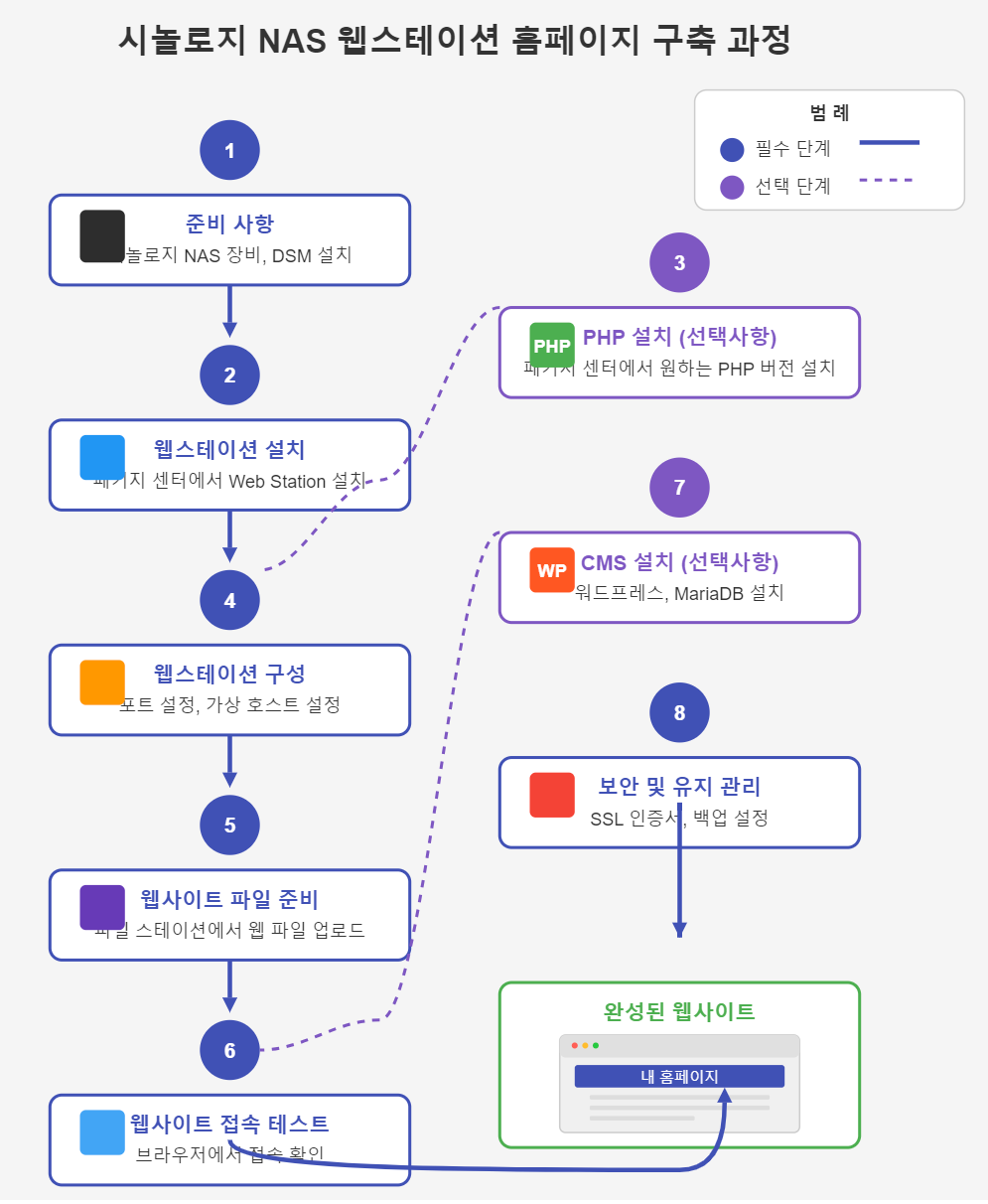 시놀로지 NAS의 웹스테이션을 사용하여 자신만의 홈페이지를 구축하는 방법을 단계별로 안내해 드리겠습니다.