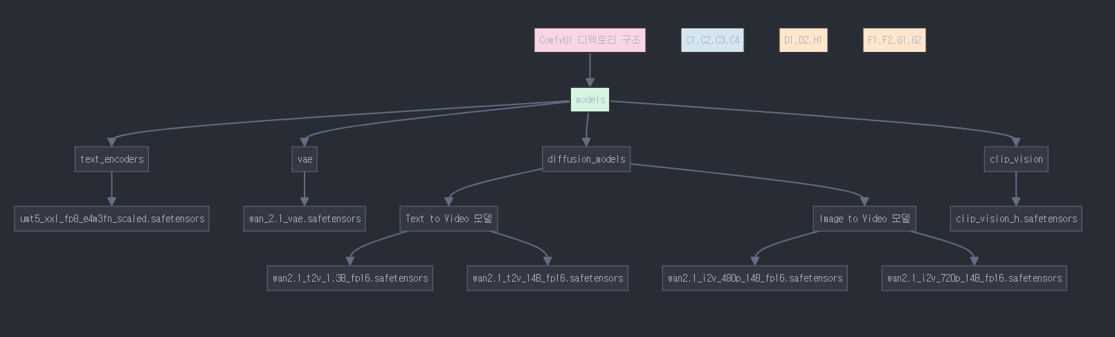 Wan 2.1 모델을 사용하기 위해서는 다음 파일들을 다운로드하고 지정된 디렉토리에 배치해야 합니다.