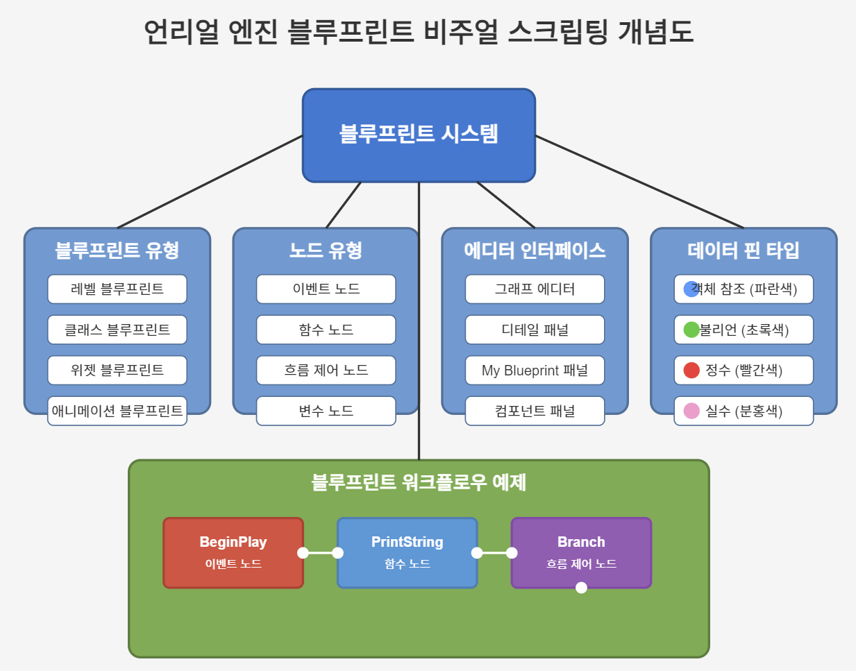 블루프린트는 언리얼 엔진에서 제공하는 비주얼 스크립팅 시스템으로, 전통적인 텍스트 기반 프로그래밍 대신 노드 기반의 인터페이스를 통해 게임 로직을 만들 수 있게 해줍니다. 노드들은 서로 연결되어 데이터 흐름이나 실행 흐름을 시각적으로 표현합니다.