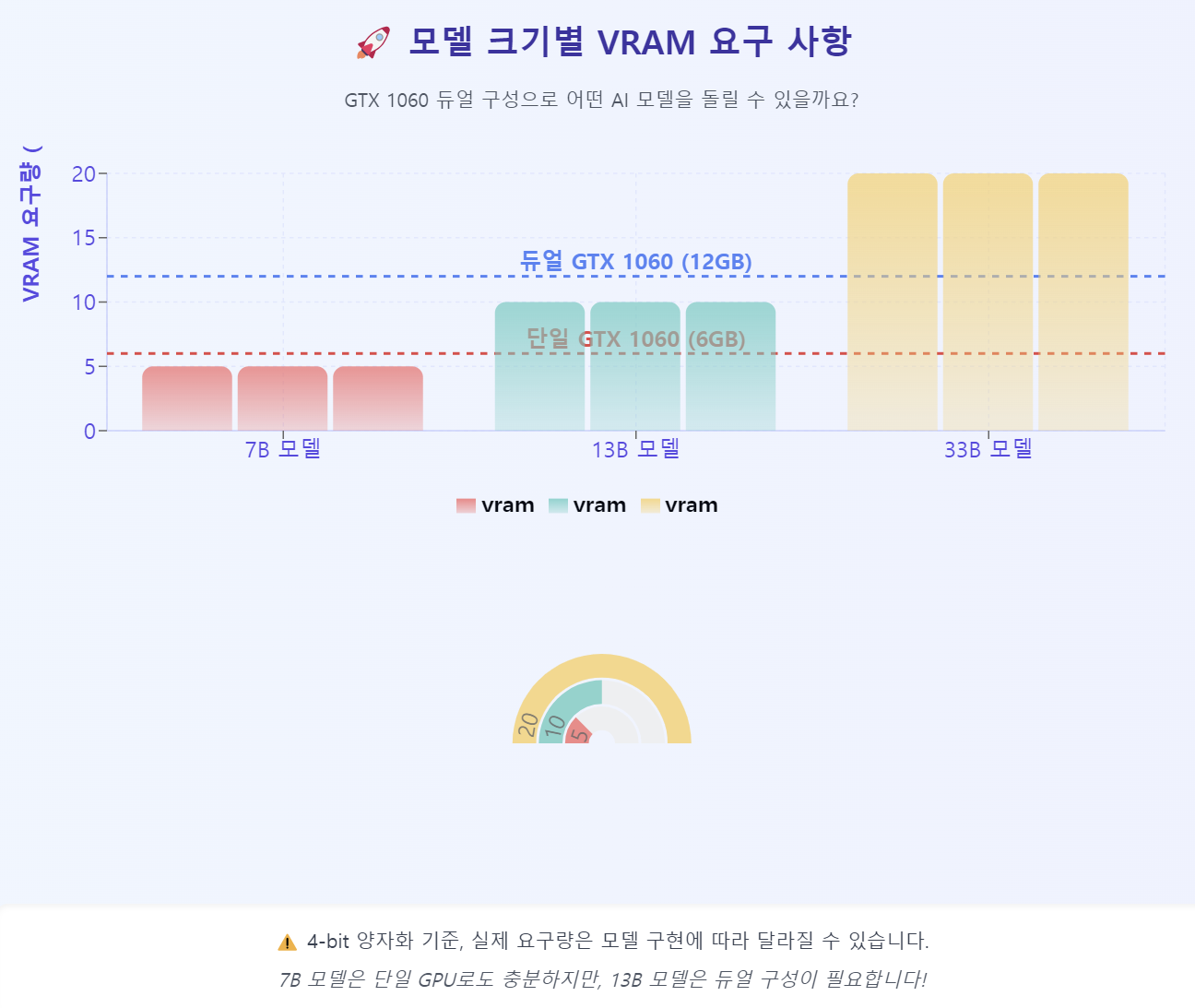 위 차트에서 볼 수 있듯이, 단일 GTX 1060으로는 7B 모델만 실행할 수 있지만, 듀얼 구성에서는 13B 모델까지 실행할 수 있습니다. 33B 이상의 모델은 더 많은 VRAM이 필요하므로 더 고성능 GPU나 더 많은 GPU가 필요합니다.