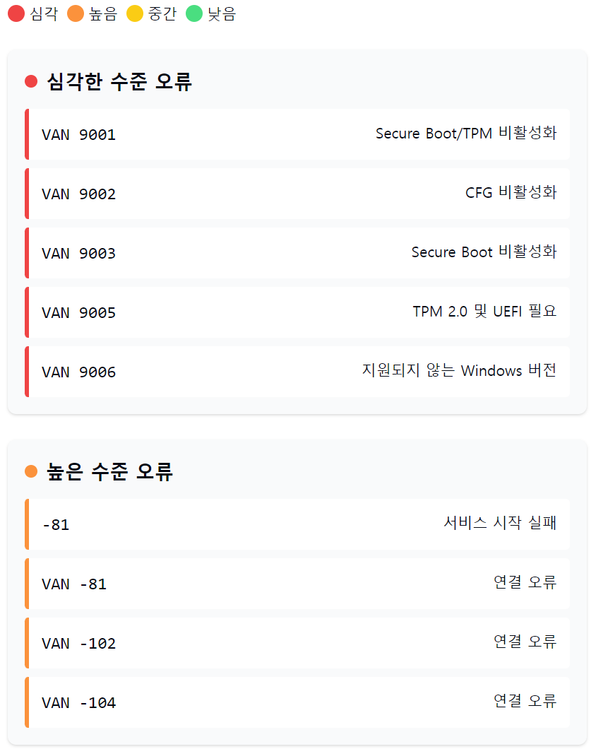 | VAN 9005 | TPM 2.0 및 UEFI 필요 | 1. BIOS 모드를 UEFI로 변경<br>2. TPM 2.0 활성화 |