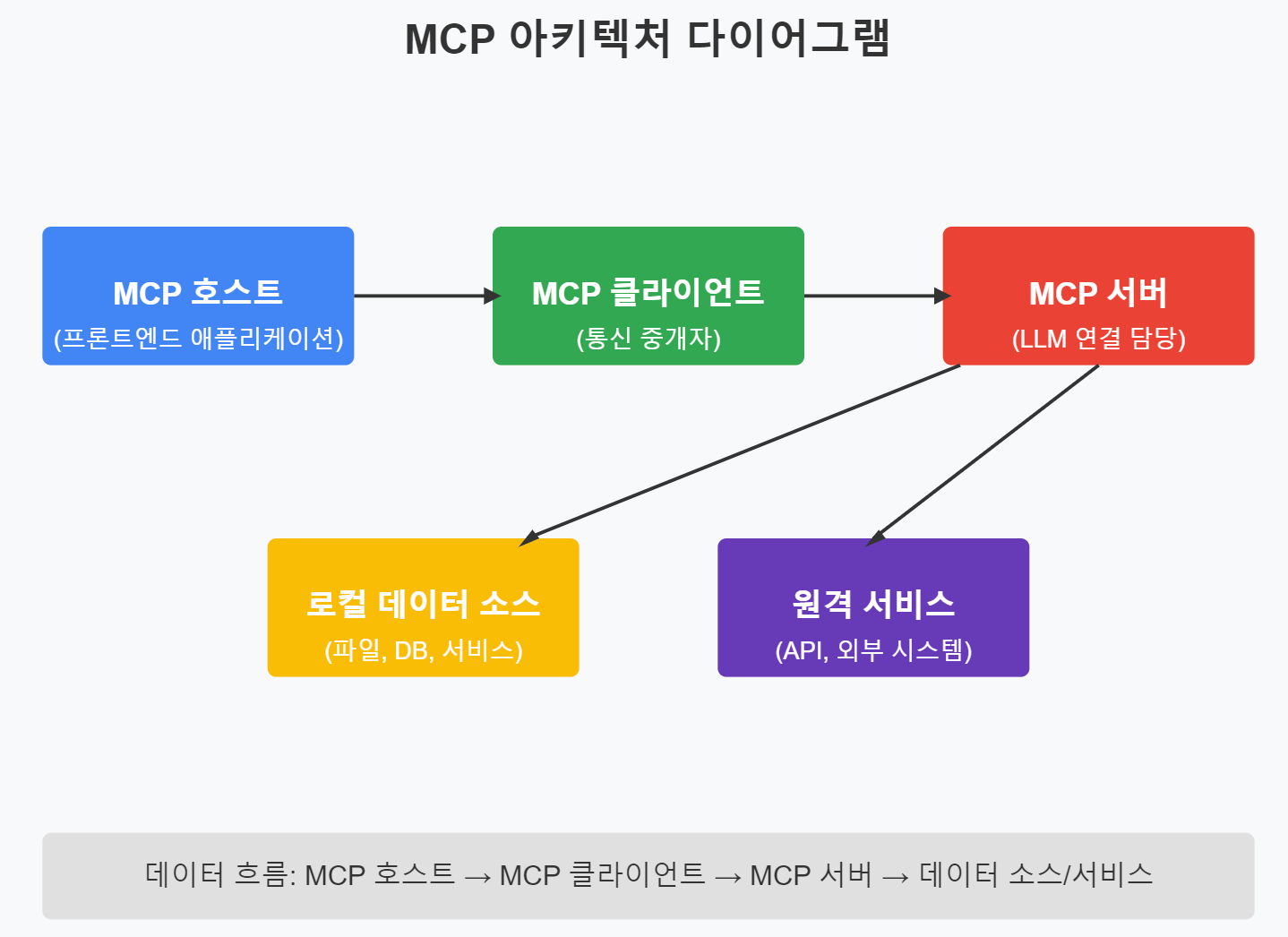 | MCP 서버 | 특정 기능을 노출하는 경량 프로그램으로, 애플리케이션과 LLM 간 연결 담당 |