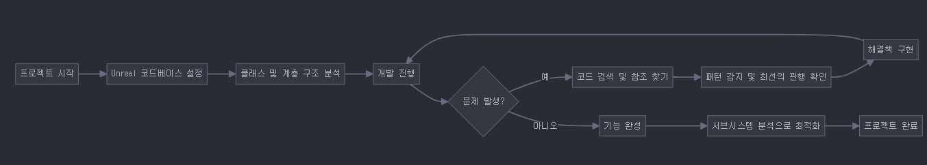 1. 프로젝트 시작 단계: 새 프로젝트를 시작할 때 Unreal Engine 코드베이스를 설정하고 주요 클래스의 구조를 분석합니다.